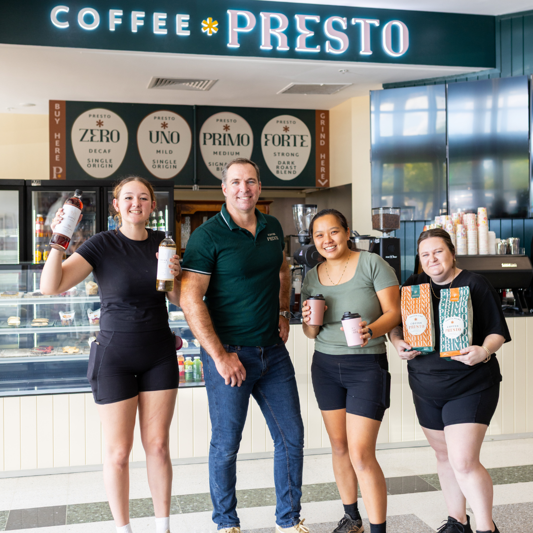 Barista-made coffee, Italian-inspired grab-and-go food selection, and Coffee Presto beans and other specialty coffee products.